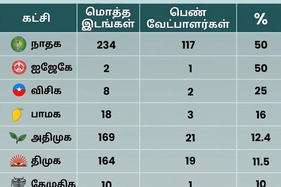 1967ஆம் ஆண்டில் மொத்த வேட்பாளர்களில் 11 பேர் மட்டுமே (1.41%) பெண்களாக இருந்த நிலையில், 2026ஆம் ஆண்டில் இந்த எண்ணிக்கை 443ஆக உயர்ந்துள்ளது. இது 11.01% ஆகும். எண்ணிக்கை உயர்ந்தாலும் விகிதாசார அடிப்படையில் பெண்கள் தொடர்ந்து மிகச் சிறிய வட்டத்திற்குள்ளேயே வைக்கப்படுகின்றனர்.