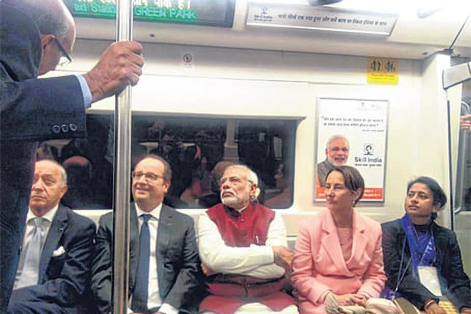 மூன்று நாள் அரசு முறைப் பயணமாக இந்தியா சென்றுள்ள பிரான்ஸ் அதிபர் ஃபிரன்சுவா ஹொலாண்ட் (அமர்ந்திருப்போரில் இடமிருந்து 2வது) இந்தியப் பிரதமர் நரேந்திர மோடியுடன் (நடுவில்) டெல்லி மெட்ரோ ரயிலில் நேற்று பயணம் செய்தார். இன்று இந்தியாவின் 67வது குடியரசு நாளையொட்டி டெல்லி செங்கோட்டையில் இன்று காலை நடக்கவிருக்கும் குடியரசு நாள் விழாவில் சிறப்பு விருந்தினராகக் ஹொலாண்ட் கலந்துகொள்கிறார். படம்: இந்தியப் பிரதமர் அலுவலக அமைச்சு