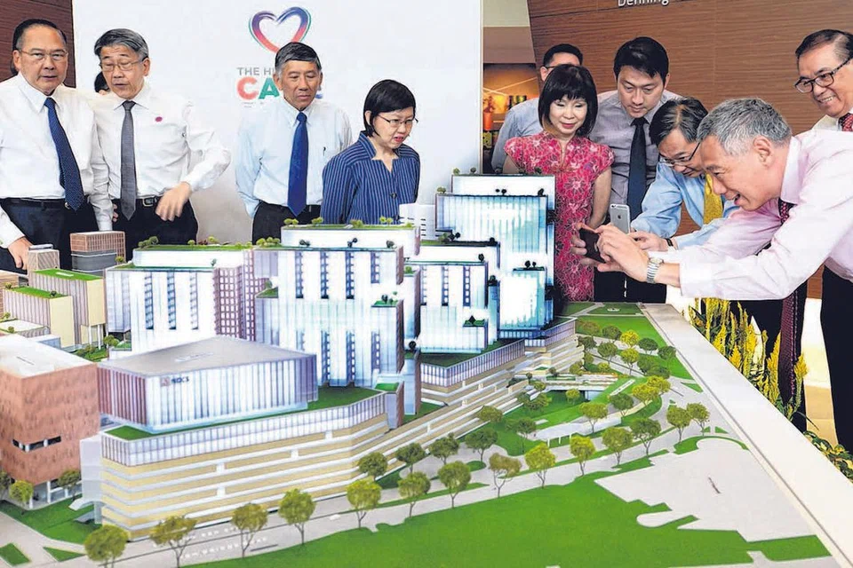 சிங்கப்பூர் பொது மருத்துவமனை பெருந்திட்டத்தின் மாதிரி வடிவத்தைத் தமது கைபேசியில் படம் எடுக்கிறார் நேற்று பெருந்திட்டத்தைத் தொடங்கி வைத்த பிரதமர் லீ சியன் லூங் (வலக்கோடி).