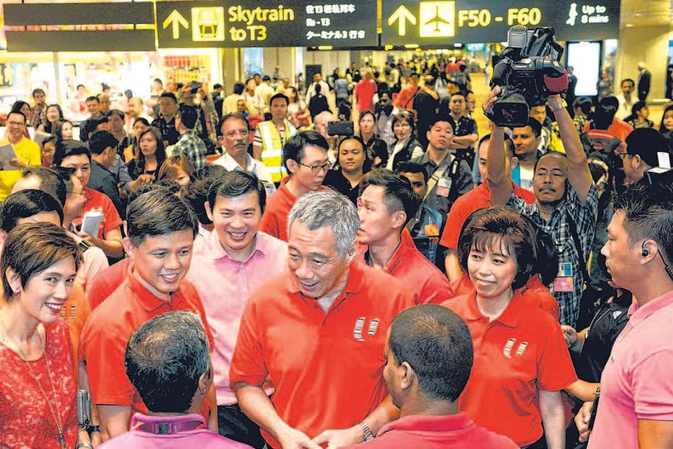 சாங்கி விமான நிலையத்தின் இரண்டாவது முனையத்தில் கிட்டத்தட்ட 200 ஊழியர்களைச் சந்தித்த பிரதமர் லீ, பொது விடுமுறை தினத்திலும் கடமையைச் செய்ததற்காக அவர்களைப் பாராட்டினார். பிரதமரின் வலப்பக்கத்தில் பிரதமர் அலுவலக அமைச்சர் சான் சுன் சிங், அவருக்கு அருகில் போக்குவரத்து மூத்த துணை அமைச்சர் ஜோசஃபின் டியோ. படம்: ஸ்ட்ரெய்ட்ஸ் டைம்ஸ்