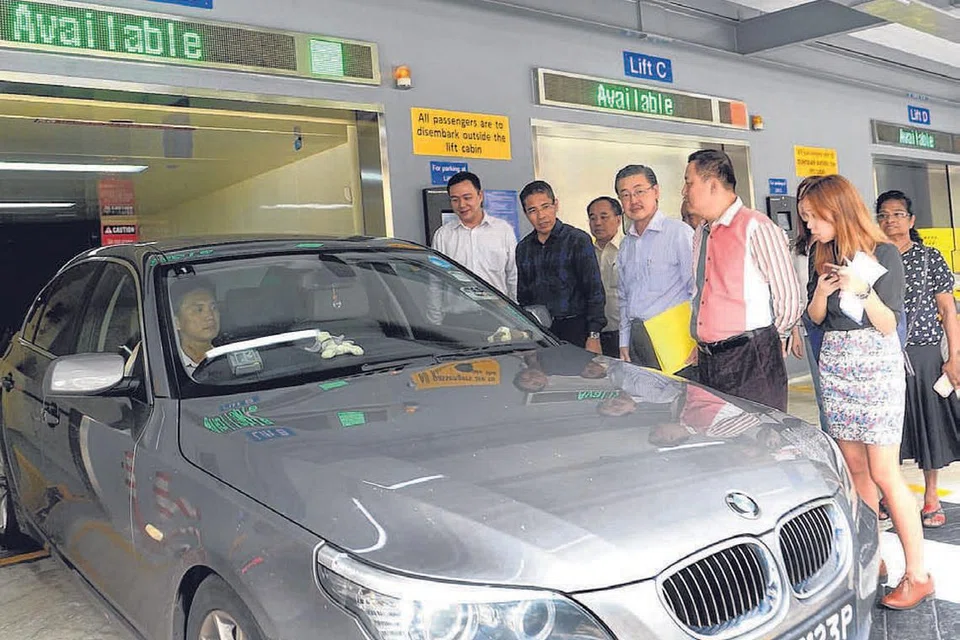 இயந்திரமயமாக்கப்பட்ட வாகன நிறுத்துமிடத்தைப் பயன்படுத்தி காரை நிறுத்தி, பிறகு அதை மீண்டும் பெறும் முறையைப் பார்வையிடும் தற்காப்பு, வெளியுறவு மூத்த துணை அமைச்சர் டாக்டர் மாலிக்கி ஒஸ்மான் (இடமிருந்து இரண்டாவது). படம்: பெரித்தா ஹரியான்