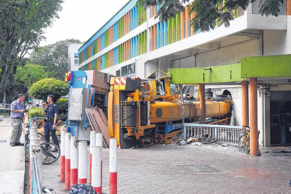 உட்லண்ட்சில் பிஓஎஸ்பி கிளை அலுவலகத்தை துளைத்துக்கொண்டு விழுந்து கிடக்கும் பாரந்தூக்கி வாகனம். வாகன ஓட்டுநர் கட்டுப் பாட்டை இழந்ததால் இந்த விபத்து நிகழ்ந்தது. வங்கி திறப்பதற்கு முன் காலை 7 மணிக்கு விபத்து நிகழ்ந்ததால் யாருக்கும் காயம் இல்லை. படம்: ஸ்ட்ரெய்ட்ஸ் டைம்ஸ்