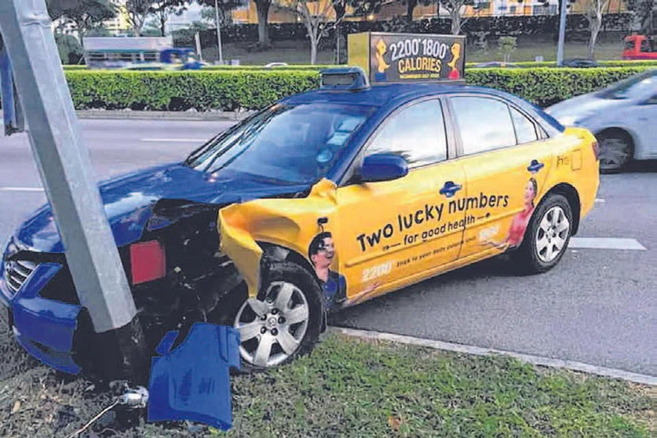 பிராடல் ரோட்டில் நேற்றுக் காலை நேரத்தில் ஒரு டாக்சி வீதி விளக்குக் கம்பம் ஒன்றில் மோதியது. கம்ஃபர்ட் நிறுவனத்தின் அந்த டாக்சியை ஓட்டி வந்தவர் திரு டோ என்று மட்டும் தன்னைக் குறிப்பிட்டுக் கொண்டார். டாக்சியில் இருந்த ஆடவரும் காயமின்றித் தப்பினார். படம்: ஸ்ட்ரெய்ட்ஸ் டைம்ஸ்