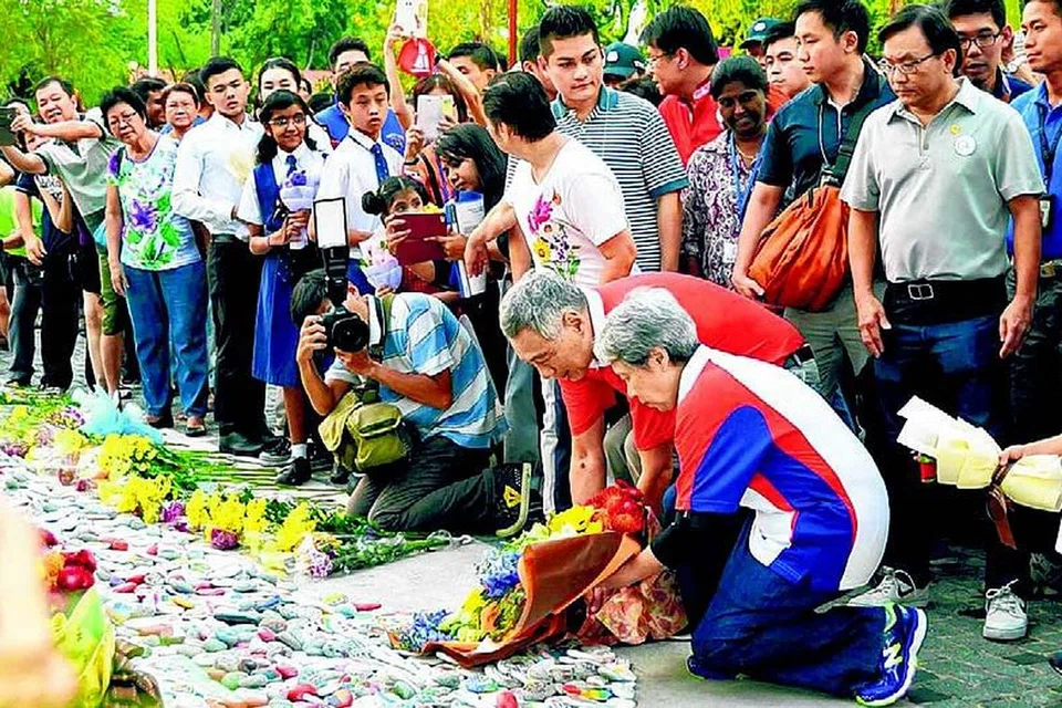 அவ்வாறு 60 பண்புநெறி ஒட்டுவில்லைகளைத் துரித நடை முடிவுற்ற செம்பவாங் பூங்காவில் வைக்கப்பட்டிருந்த சிங்கப்பூரின் வரைபடம் கொண்ட பெரிய பல கையில் அந்தக் குடும்பங்கள் ஒட்டின. மேலும் அங்கு நடந்த புகைப் படக் கண்காட்சியில் அமரர் லீயின் புகைப்படங்களுடன் அவ ரது பொன்மொழிகளும் இடம் பெற்றிருந்தன. "சிங்கப்பூரை வடிவமைத்த பண்புநெறிகள்" எனும் வாசகத்துக்கு மேல் உள்ள சிங்கப்பூர் வரைபடத்தில் பண்புநெறி வில்லைகள் ஒட்டப்பட்டன. அந்தப் பண்புநெறிகளைக் கட்டிக்காப்போம் என்று அனைவரும் கையை உயர்த்தி உறுதி தெரிவித்தனர். படம்: கோ பூன் வான் ஃபேஸ்புக்