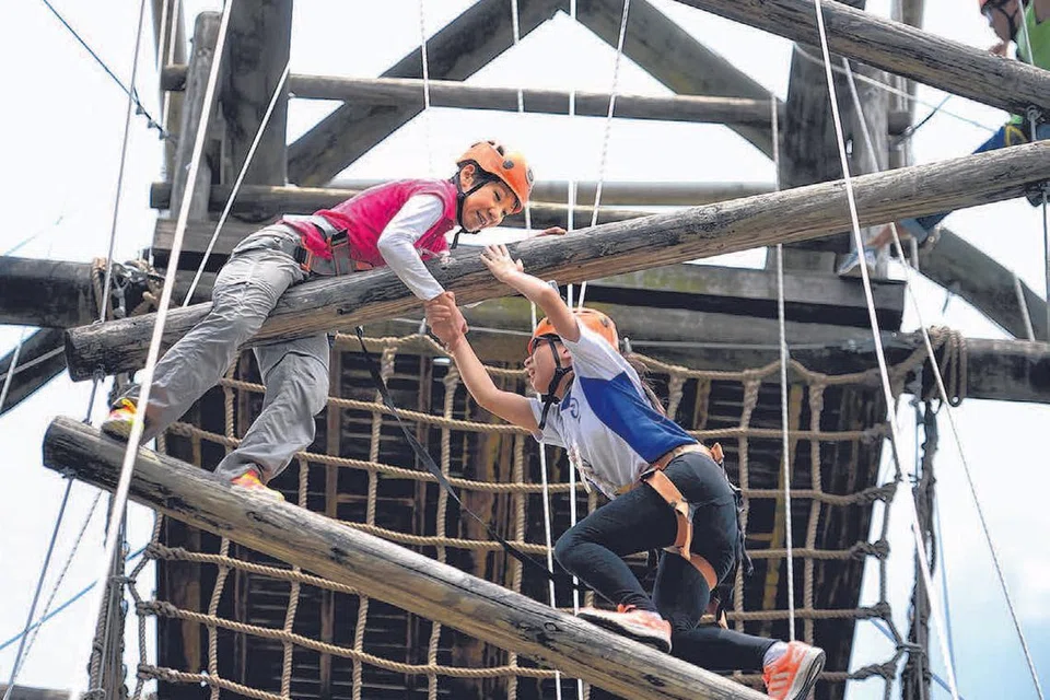 உபின் புறப்பாடத்திட்ட பள்ளிக்கூடத்தில் செயல்திட்டத்தில் ஈடுபட்டுள்ளோருடன் சேர்ந்து அமைச்சர் கிரேஸ் ஃபூவும் (இடது) கயிற்றில் மேலே ஏறும் பயிற்சியில் ஈடுபட்டார். படம்: ஸ்ட்ரெய்ட்ஸ் டைம்ஸ்