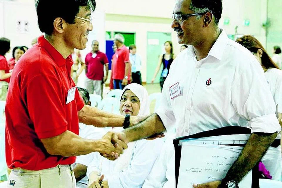 மசெக வேட்பாளர் முரளி பிள்ளையும் (வலது) சிஜகவின் டாக்டர் சீ சூன் ஜுவானும் நேற்று வேட்புமனுத் தாக்கல் மையத்தில் தங்கள் வாழ்த்துகளைப் பரிமாறிக் கொண்டனர். படம்: தேர்தல் துறை