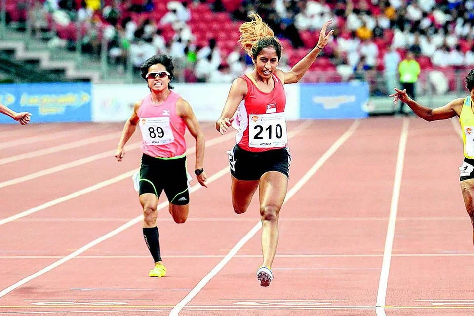 மற்ற போட்டி யாளர் களைப் பின்னுக்குத் தள்ளி மின்னல் வேகத்தில் பந்தயத்தை முடித்து தங்கம் வென்ற சாந்தி பெரேரா (நடுவில்). படம்: தி நியூ பேப்பர்