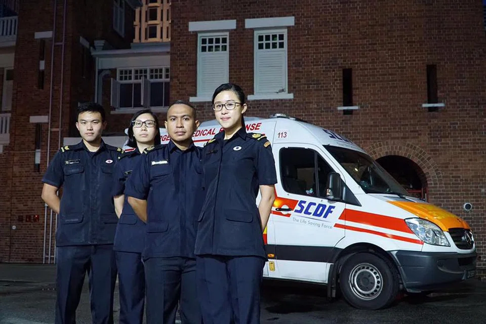 இஸ்தானாவில் கடந்த வியாழக்கிமை நடந்த அமைச்சரவை சந்திப்பின்போது மூர்ச்சையாகிய நிதி அமைச்சர் ஹெங் சுவீ கியட்டிற்கு மருத்துவ முதலுதவி வழங்கிய சிங்கப்பூர் குடிமைத் தற்காப்புப் படை குழுவினர். (வலமிருந்து) ஸ்டாஃப் சார்ஜண்ட் ஜெனிஸ் லீ, ஸ்டாஃப் சார்ஜண்ட் முகமது இம்ரான், முதலுதவி பயிற்சியாளர் ஷீனா சியாங், முழுநேர தேசிய சேவையாளர் கார்ப்பரல் இயன் லோக். ஆம்புலன்ஸ் எண் 113யைச் சேர்ந்த இவர்கள் திரு ஹெங்கிற்குப் புரிந்த சிறப்பான முதலுதவியைப் பிரதமர் லீ சியன் லூங் பாராட்டியுள்ளார். படம்: சிங்கப்பூர் குடிமைத் தற்காப்புப் படை ஃபேஸ்புக்