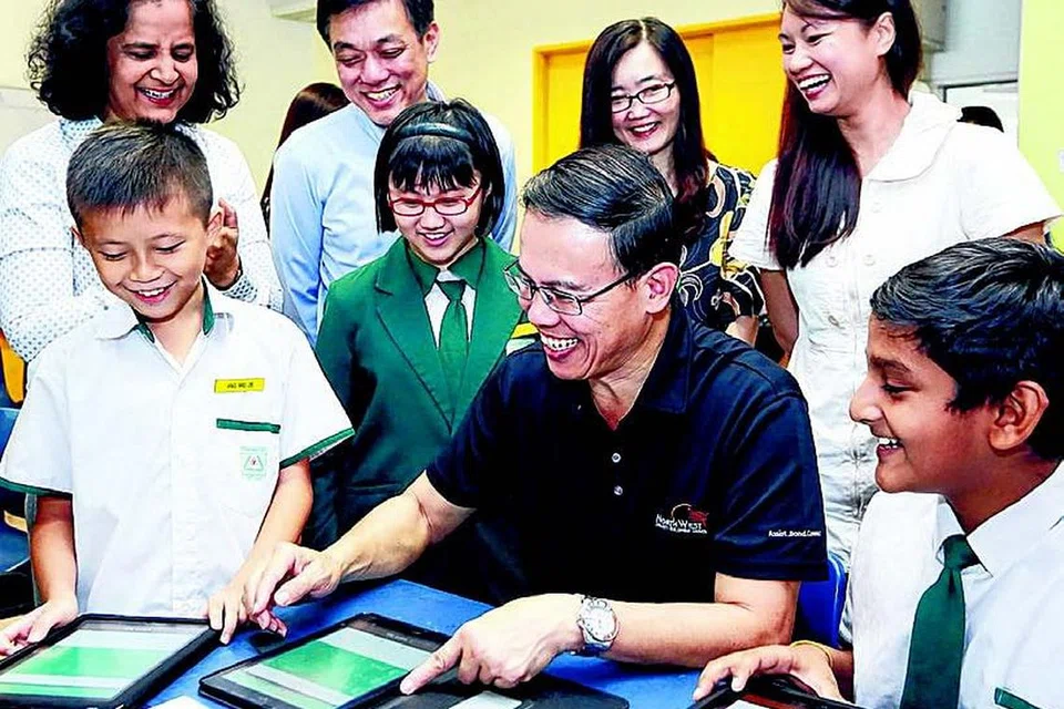 நியூ டவுன் தொடக்கப்பள்ளியில் Mozzie Watch Keeper @ North West செயலியைத் தொடங்கி வைத்த வடமேற்கு வட்டார மேயர் டாக்டர் டியோ ஹோ பின், பள்ளி மாணவர்களுடன் செயலியைப் பயன்படுத்திப் பார்க்கிறார். படம்: சீ கேப்ஷன்