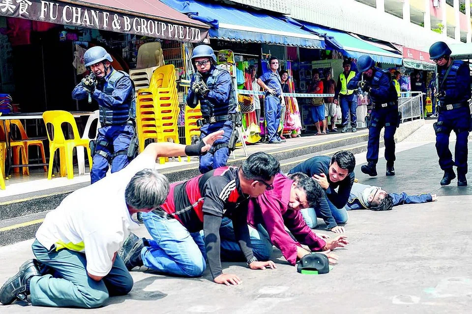 காப்பிக் கடையில் இருந்த ஐந்து பேரை இரண்டு துப்பாக்கிக்காரர்கள் பிணையாகப் பிடித்து, அதை உள்துறைக் குழுவினர் எதிர்கொண்டதாக நடந்த பாவனைப் பயிற்சி நேற்று சொங் பாங் சந்தை, உணவங்காடிப் பகுதியில் நிகழ்த்திக் காட்டப்பட்டது. படம்: ஸ்ட்ரெய்ட்ஸ் டைம்ஸ்