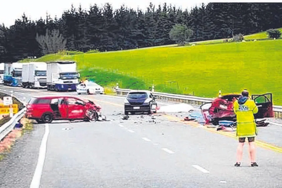 வாடகை டொயோட்டா கார் ஒன்றை நியூசிலாந்தில் ஓட்டிச் சென்ற சிங்கப்பூரர் லியூ வெய் கியோங் இரட்டை மஞ்சள் கோடுகளைத் தாண்டி சில வாகனங்களை முந்திச்செல்ல விழைந்தபோது இரண்டு கார்கள், எதிர்த்திசையில் பயணம் செய்துகொண்டிருந்த மோட்டார் சைக்கிள் ஆகியவற்றின்மீது மோதினார். படம்: @GUNNY_NZ/INSTAGRAM