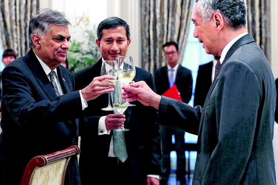 பிரதமர் லீ சியன் லூங் அளித்த பகல் விருந்தில் அவருடன் இலங்கைப் பிரதமர் ரணில் விக்ரமசிங்கே (இடது). வெளியுறவு அமைச்சர் விவியன் பாலகிருஷ்ணன் நடுவே உள்ளார். படம்: ஸ்ட்ரெய்ட்ஸ் டைம்ஸ்