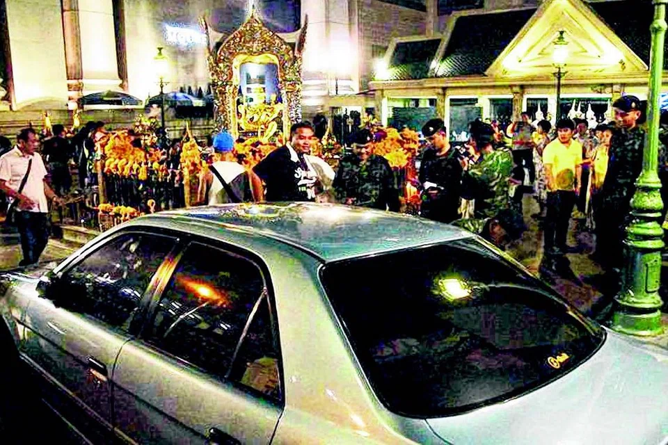அதனால் கார் கட்டுப்பாட்டை இழந்தது. அந்தக் கோவிலுக்குள் நுழைந்து அங்கு வழிபாட்டில் ஈடுபட்டிருந்தவர்கள் மீது மோதி யது என்று போலிஸ் தெரிவித்ததாக ஏஎப்ஃபி செய்தி நிறுவனம் குறிப் பிட்டது. இந்த விபத்து பற்றிய மேல் விவரங்கள் தெரியவில்லை. விபத்து நிகழ்ந்ததும் போலிஸ் சம் பவ இடத்துக்கு விரைந்தது. "நாங்கள் சாமி கும்பிட்டுக் கொண்டு இருந்தோம். திடீரென்று பெரும் சத்தம் கேட்டது. கார் ஒன்று கோவிலுக்குள் நுழைந்தது. அங்கும் இங்கும் அலறியபடி ஓடினோம். "ஏதோ குண்டு வெடித்து விட்டது என்று நினைத்தோம். இருந்தாலும் எல்லாருமே அமைதி யாக இருந்தோம்," என்று சம்பவம் நிகழ்ந்தபோது எரவான் கோவி லில் வழிபாடு நடத்திகொண்டு இருந்த வியட்னாமைச் சேர்ந்த சுற்றுப்பயணியான 21 வயது கிறிஸ்டி சொன்னதாக ஏஎப்ஃபி செய்தி நிறுவனம் தெரிவித்தது. அந்தக் காரை ஓட்டிச் சென்ற மாதுக்கு வயது சுமார் 40 இருக் கும் என்று தெரிந்தது.