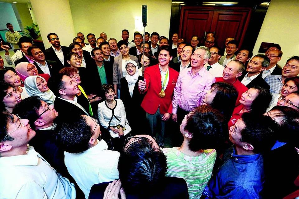 நாடாளுமன்றத்தில் பிரதமர் லீயுடனும் மன்ற உறுப்பினர்களுடனும் 'செல்ஃபி' எடுத்து மகிழும் ஜோசஃப் ஸ்கூலிங். பிரதமருக்கு அருகில் ஸ்கூலிங்கின் பெற்றோர். படம்: சாவ்பாவ்