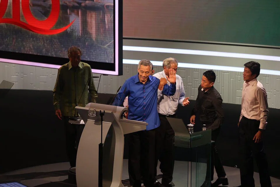 தமது ஆங்கில உரையின்போது பிரதமருக்குத் திடீரென உடல்நலக்குறைவு ஏற்பட்டது. உடனடியாக துணைப் பிரதமர் டியோ சீ ஹியன், தற்காப்பு அமைச்சர் இங் எங் ஹென் ஆகியோர் விரைந்து மேடையில் ஏறி பிரதமரைக் கைத்தாங்கலாகப் பிடித்துக்கொண்டனர். பின்னர் அவர் மேடையின் பின்புறம் அழைத்துச் செல்லப்பட்டார். பிறகு மருத்துவர்கள் குழு அவரைப் பரிசோதித்து, சிகிச்சை அளித்தது. இதையடுத்து, செய்தியாளர்களைச் சந்தித்த துணைப் பிரதமர் தர்மன் சண்முகரத்னம், பிரதமருக்கு லேசான மயக்கம்தான் என்றும் நீண்ட நேரம் நின்றிருந்ததும் உடலில் நீர்ச்சத்து குறைந்ததுமே அதற்குக் காரணம் என்றும் தெரிவித்தார். பிரதமர் நலமுடன் இருப்பதாகச் சொன்ன திரு தர்மன், கவலைப்படும்படியாக எதுவுமில்லை என்று மருத்துவக் குழு தெரிவித்ததாகவும் சிறிது ஓய்விற்குப் பின் அவர் தமது உரையைத் தொடர விரும்புவதாகவும் சொன்னார். பிரதமரின் இதயம் நன்றாக செயல்படுவதாகவும் பக்கவாதம் எதுவும் ஏற்படவில்லை என்றும் பிரதமர் அலுவலகம் தெரிவித்தது. இதையடுத்து, இரவு 9.20 மணிக்கு நின்ற தமது உரையை 10.40 மணிக்கு மீண்டும் தொடங்க பிரதமர் வந்ததும் அரங்கிலிருந்த பார்வையாளர்கள் எழுந்து நின்று பெரும் கரவொலி எழுப்பி அவரை வரவேற்றனர். படம்: ஸ்ட்ரெய்ட்ஸ் டைம்ஸ்