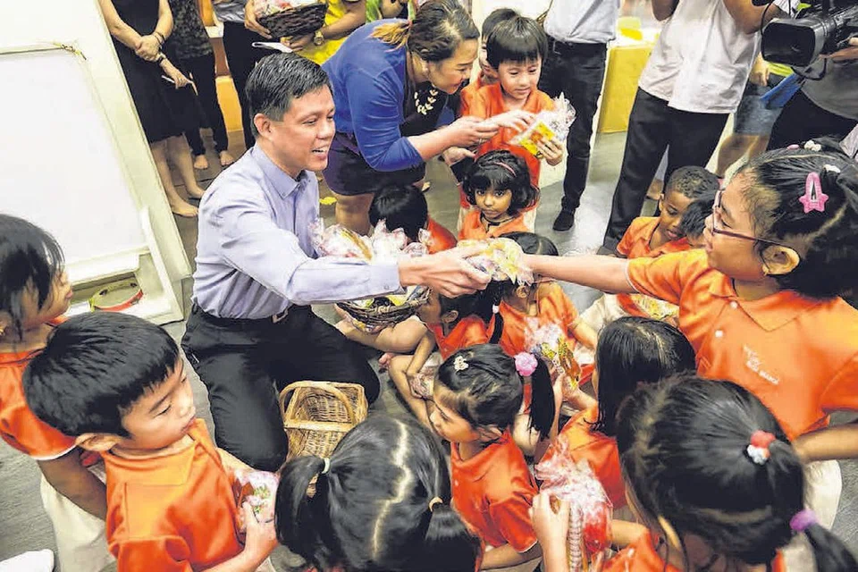 சின் சுவீயில் இருக்கும் மை ஃபர்ஸ்ட் பள்ளிக்கூடத்தில் நடந்த குழந்தைகள் தினக் கொண்டாட்டத்தின்போது பிள்ளைகளுக்கு என்டியுசி தலைமைச் செயலாளர் சான் சுன் சிங் அன்பளிப்புப் பையை வழங்குகிறார். படம்: ஸ்ட்ரெய்ட்ஸ் டைம்ஸ்