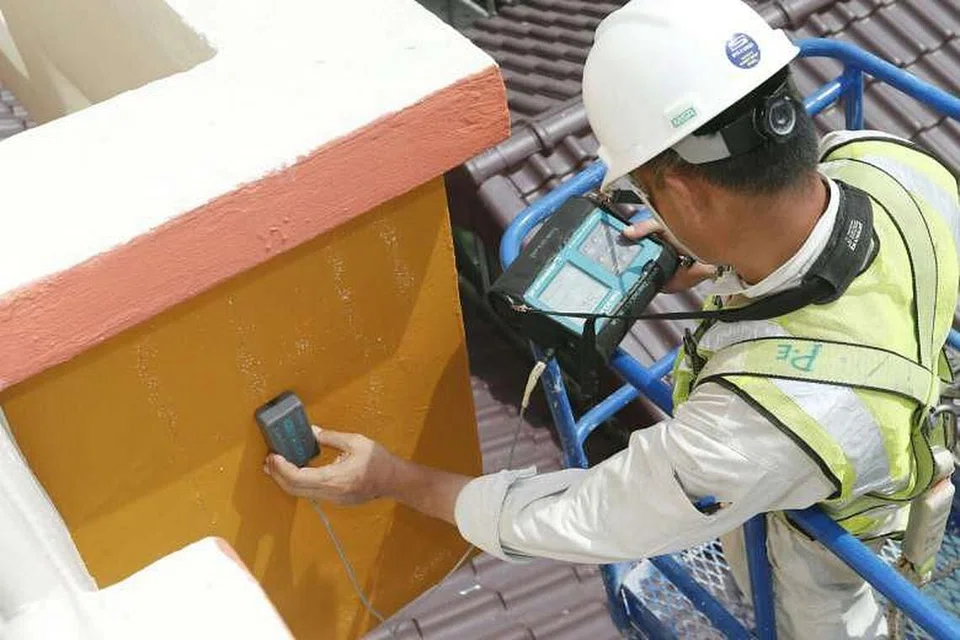 வீவக பொறியாளர் ஒருவர் ஸ்ட்ரீட் 23ல் உள்ள புளோக் 201E-யின் நிழல் மாடத்தை ஊடுகதிர் மூலம் சோதனை செய்கிறார். படம்: ஸ்ட்ரெய்ட்ஸ் டைம்ஸ்