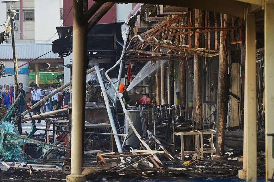 கடுமையாகப் பற்றி எரிந்த தீயினால் ஈரச் சந்தையின் கூரை சரிந்து பலத்த சேதமுற்றது. படம்: ஸ்ட்ரெய்ட்ஸ் டைம்ஸ்