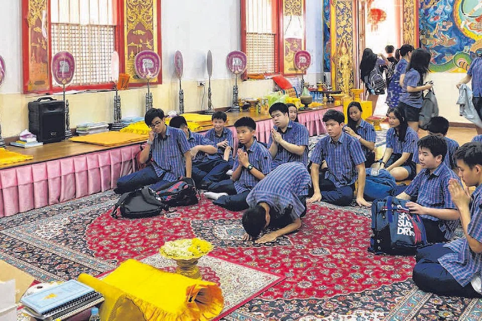 செயின்ட் பிரான்சிஸ் மெதடிஸ்ட் பள்ளியைச் சேர்ந்த தாய்லாந்து மாணவர்கள் புக்கிட் மேரா ரோட்டில் உள்ள தாய்லாந்துவாசிகளின் பௌத்த ஆலயத்தில் சிறப்புப் பிரார்த்தனை நடத்தினர். படம்: ஸ்ட்ரெய்ட்ஸ் டைம்ஸ்