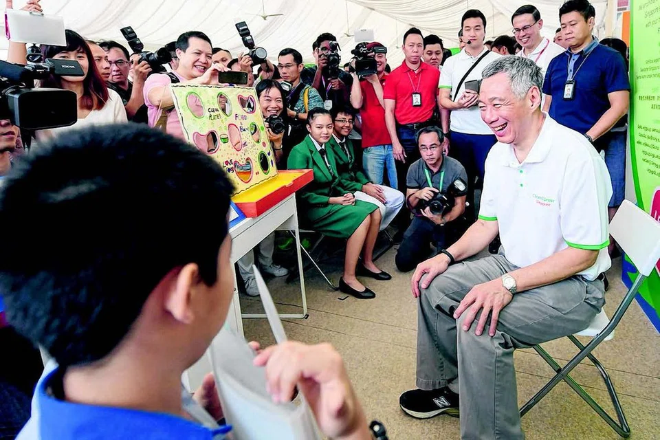 காத்திப் எம்ஆர்டி நிலையத்திற்கு எதிரே இருக்கும் திடலில் நடந்த தூய்மை, பசுமை கேளிக்கை விழாவில் சிறாருடன் அளவளாவும் பிரதமர் லீ சியன் லூங். படம்: ஸ்ட்ரெய்ட்ஸ் டைம்ஸ்