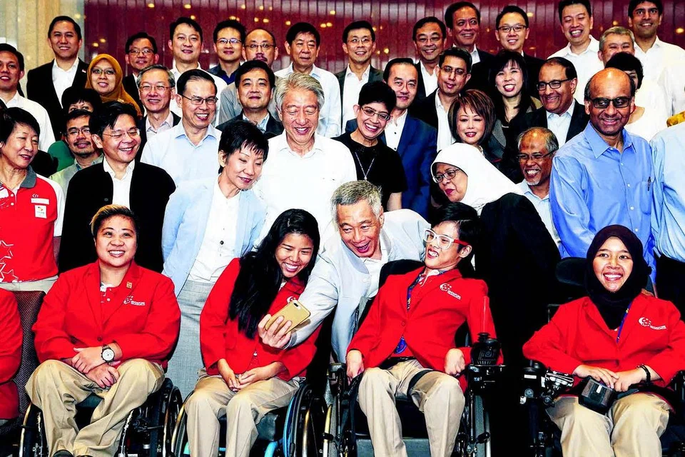 நாடாளுமன்றத்தில் குழுவாக இணைந்து அதிகாரபூர்வமாக புகைப்படம் எடுத்துக்கொள்வதற்கு முன்பாக பாராலிம்பிக் விளையாட்டாளர்களுடன் 'செல்ஃபி' எடுத்துக்கொள்ளும் பிரதமர் லீ சியன் லூங் (நடுவில்). படம்: ஸ்ட்ரெய்ட்ஸ் டைம்ஸ்