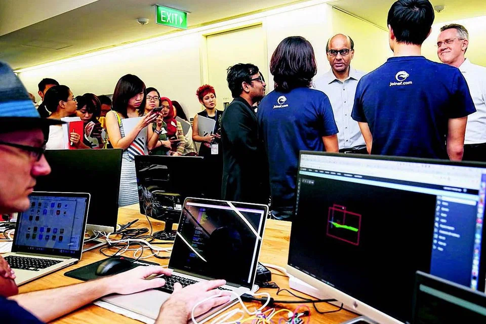 எஸ்ஜிஇன்னோவேட் அமைப்பின் அறிமுக நிகழ்ச்சியில் நேற்று கலந்துகொண்ட துணைப் பிரதமரும் பொருளியல், சமுதாயக் கொள்கைளுக்கான ஒருங்கிணைப்பு அமைச்சருமான தர்மன் சண்முகரத்னம் அமைப்பை உருவாக்க உதவிய பங்குதாரர்களுடன் உரையாடுகிறார். படம்: ஸ்ட்ரெய்ட்ஸ் டைம்ஸ்