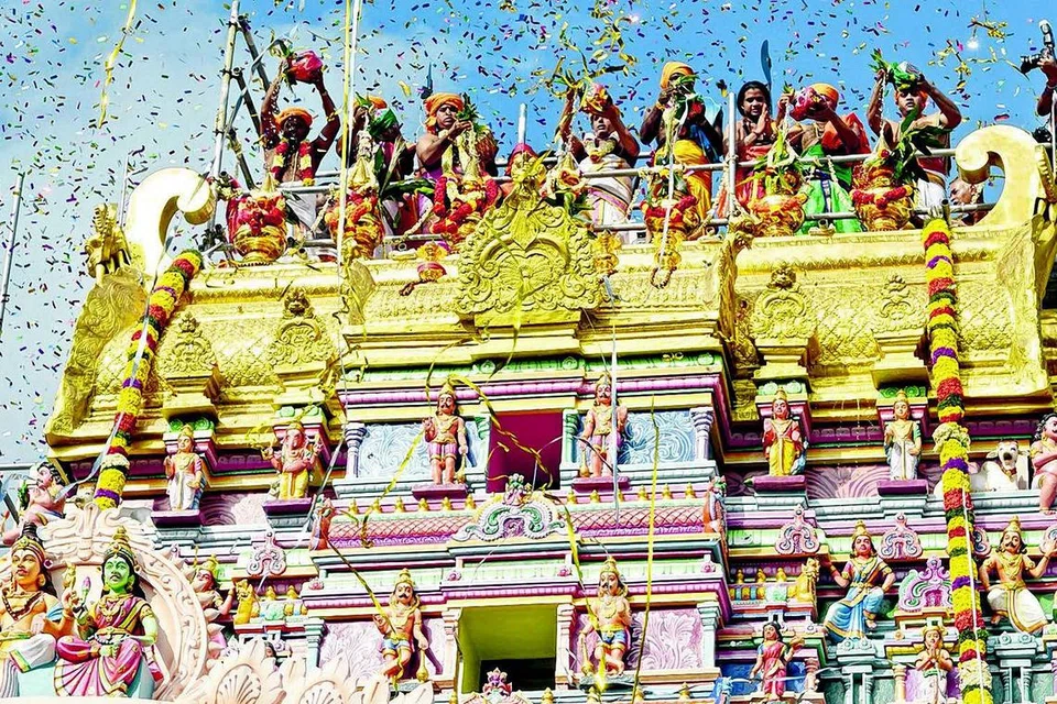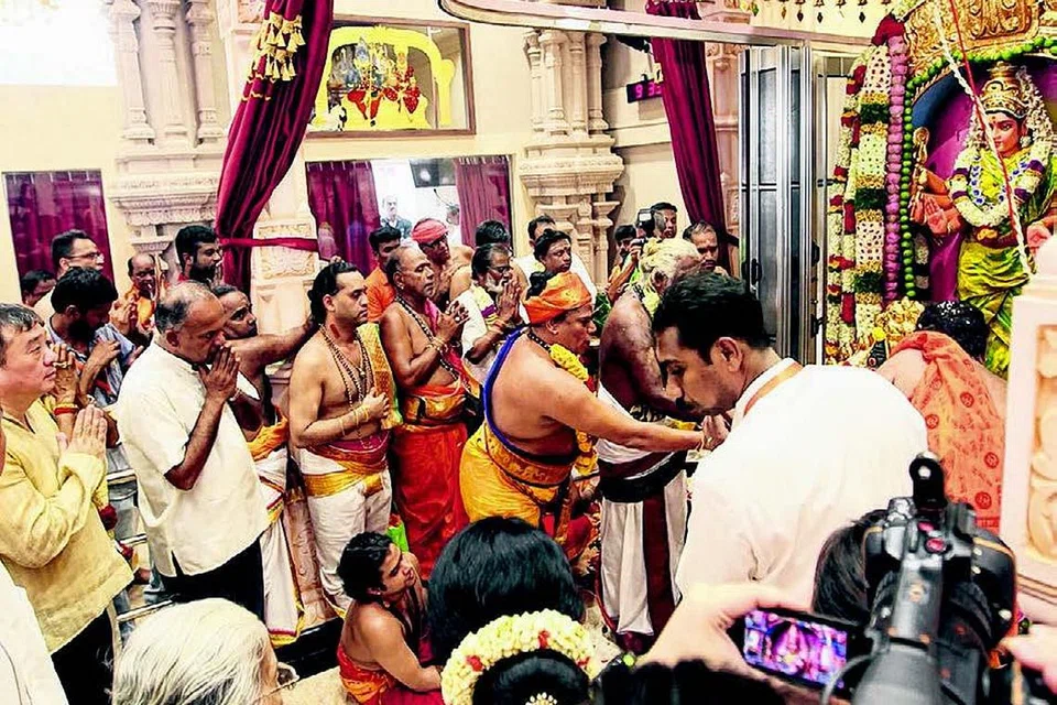 $2.7 மி. செலவில் புதுப்பிப்புப் பணிகள் மேற்கொள்ளப்பட்ட ஸ்ரீ சிவ துர்க்கா ஆலயத்தின் கோபுர கலசங்கள் மீது புனித நீர் ஊற்றும் சிவாச்சாரியர்கள்.
