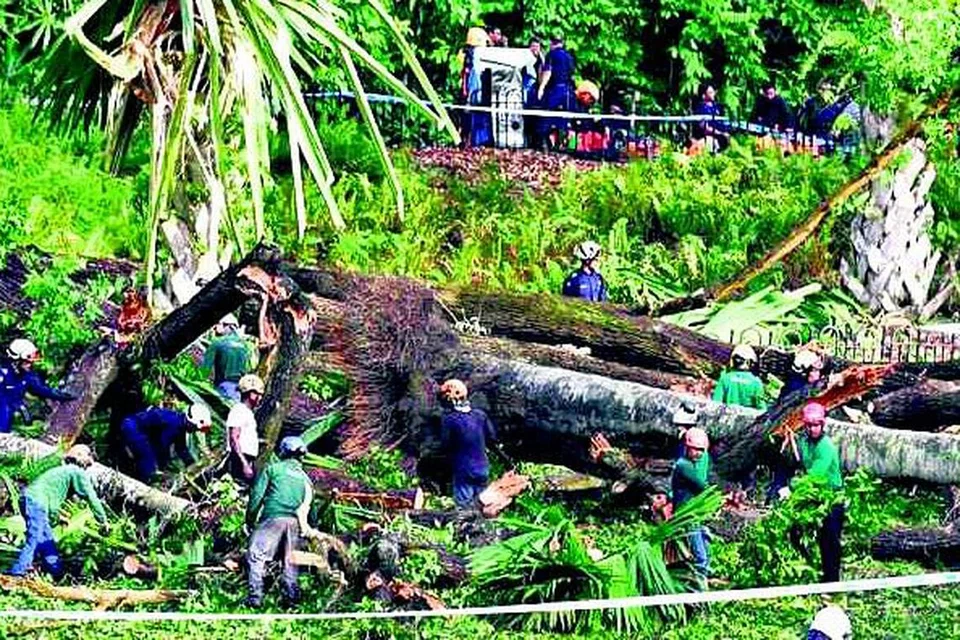 பூமலையில் இருக்கும் ஷா அறநிறுவன பல்லிய இசை மேடை அருகே தம்புசு மரம் விழுந்துவிட்டது. அதை அகற்றும் பணி நேற்று உடனடியாக நடந்தது. படம்: ஸ்ட்ரெய்ட்ஸ் டைம்ஸ்