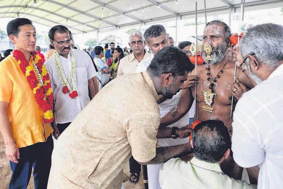 நேர்த்திக்கடனை வெற்றிகரமாக நிறைவேற்றிய பக்தர் ஒருவரின் அலகுகள் புனிதமரம் ஸ்ரீபாலசுப்பிரமணியர் ஆலயத்தில் கழற்றப்படுவதை கல்வி அமைச்சர் (உயர்கல்வி, திறன்கள்) ஓங் யி காங் பார்வையிடுகிறார். படம்: ஸ்ட்ரெய்ட்ஸ் டைம்ஸ்