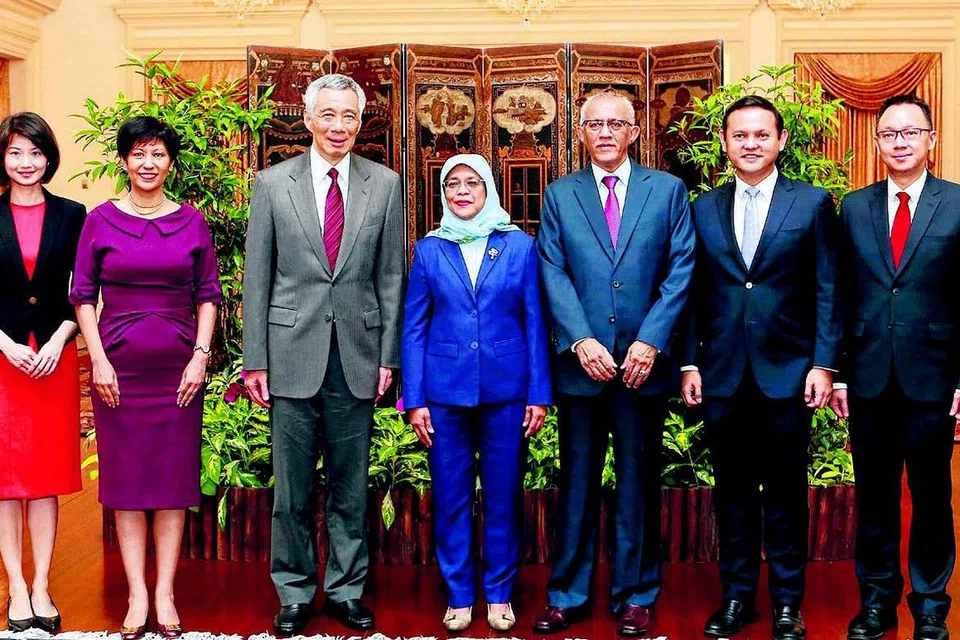 (இடமிருந்து) உள்துறை, தேசிய வளர்ச்சி அமைச்சுகளின் மூத்த நாடாளுமன்றச் செயலாளர் சுன் சூலிங், பிரதமர் அலுவலக அமைச்சரும் கல்வி, நிதி ஆகியவற்றின் இரண்டாம் அமைச்சருமான இந்திராணி ராஜா, பிரதமர் லீ சியன் லூங், அதிபர் ஹலிமா யாக்கோப், அவரது கணவர் அப்துல்லா அல்ஹப்ஷி, தேசிய வளர்ச்சி, மனிதவள துணை அமைச்சர் ஸாக்கி முகம்மது, வெளியுறவு, வர்த்தக தொழில் அமைச்சுகளின் மூத்த நாடாளுமன்றச் செயலாளர் டான் வு மெங். படம்: சாவ் பாவ்