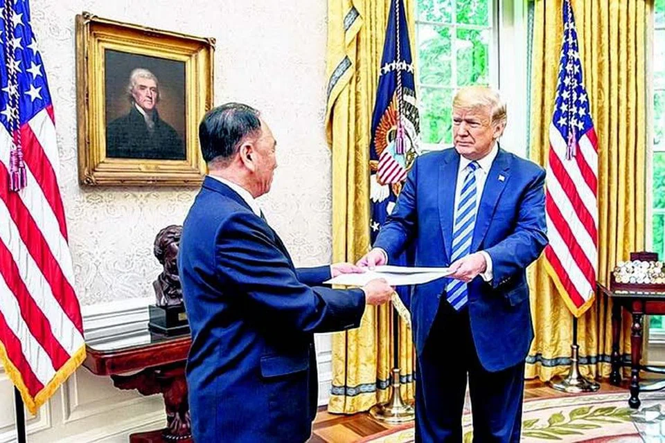 வடகொரியத் தலைவரின் கடிதத்தை அதிபர் டிரம்ப்பிடம் ஒப்படைத்த அந்நாட்டின் தூதர் கிம் யோங் சோல். இந்தக் கடிதம் பெரிதாகவும் ஆர்வத்தை ஏற்படுத்துவதாகவும் இருந்தது என்று குறிப்பிட்ட அதிபர் டிரம்ப், உடனே அதைப் பிரித்துப் பார்க்கவில்லை என்றார். வெள்ளை மாளிகையின் அதிகாரிகள் அந்தக் கடிதத்தை கவனமாக பரிசீலித்து வருகின்றனர். படம்: வெள்ளை மாளிகை