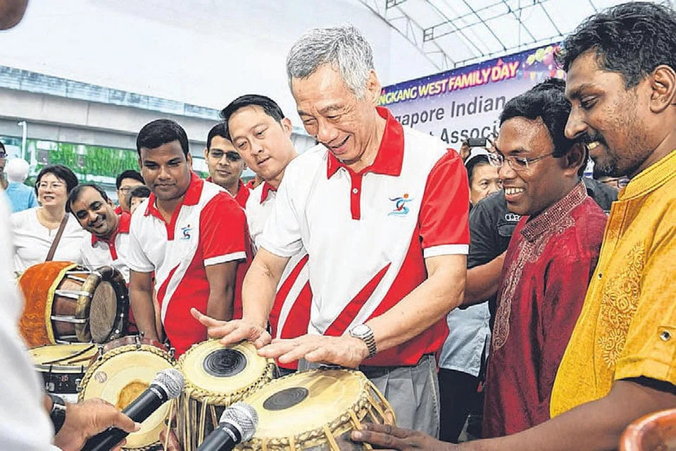 செங்காங் வெஸ்ட் குடும்ப தின விழாவில் நேற்று சிறப்பு விருந்தினராக கலந்துகொண்ட பிரதமர் லீ சியன் லூங், இந்தியரின் பாரம்பரிய தாள வாத்தியக் கருவியான தபேலாவில் தமது திறனை மகிழ்ச்சியுடன் சோதித்துப் பார்க்கிறார். அவருக்கு அருகில் செங்காங் வெஸ்ட் தனித் தொகுதி நாடாளுமன்ற உறுப்பினர் டாக்டர் லாம் பின் மின் உள்ளார். படம்: ஸ்ட்ரெய்ட்ஸ் டைம்ஸ்