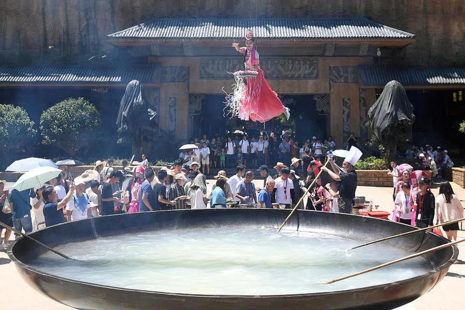 இவ்வளவு பெரிய பானையை நீங்கள் இதுவரை பார்த்ததுண்டா? சீனாவின் குவாங்ஸி ஸுவாங் மாநிலத்தில் அந்தரத்தில் தொங்கிக்கொண்டிருக்கும் கலைஞர் ஒருவர் அரிசி மற்றும் 'நூடல்ஸ்'ஸை கொதிக்கும் இந்தப் பானைக்குள் வீசுகிறார். படம்: ராய்ட்டர்ஸ்