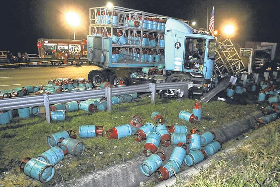 ஒரு மோட்டார் சைக்கிள் ஓட்டுநர், அவருடன் பயணித்தவர், சிமெண்ட் ஏற்றிச் சென்ற லாரியின் ஓட்டுநர் ரவீந்திரன், 26, ஆகிய மூவரும் மாண்டுபோனதாக நெகிரி செம்பிலான் போக்குவரத்து விசாரணை, அமலாக்கத் துறையின் தலைவர் இப்ராஹிம் முகமது அப்துல் காதிர் கூறினார். லாரியிலிருந்த எரிவாயுக் கலன்கள் சாலையில் சிதறிக் கிடந்தன. இந்த விபத்து காரணமாக அந்தப் பகுதியில் ஏழு கிலோ மீட்டர் தூரத்துக்கு போக்குவரத்து நெரிசல் ஏற்பட்டதாக 'தி ஸ்டார்' தெரிவித்தது. படம்: பெர்னாமா