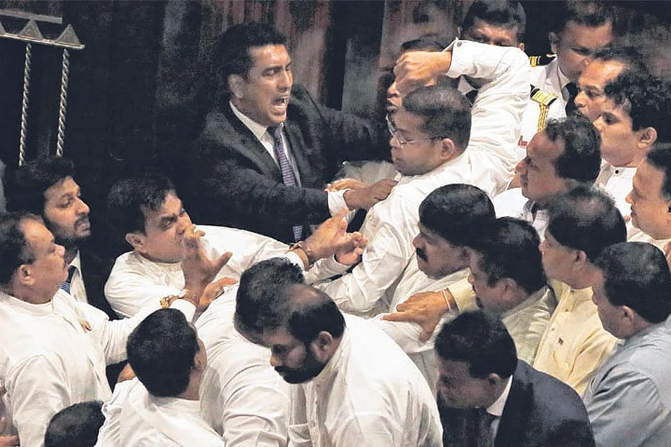 இலங்கை நாடாளுமன்றத்தில் ரணில் தரப்பு உறுப்பினர்களும் ராஜபக்சே மற்றும் சிறிசேன தரப்பு உறுப்பினர்களும் நேற்று ஒருவருக்கொருவர் அடித்துக்கொண்டனர். இலங்கையில் இப்போது பிரதமரும் இல்லை, அமைச்சரவையும் இல்லை என்று கூறி மன்றத்தை நாயகர் ஒத்திவைத்துவிட்டார். படம்: இபிஏ