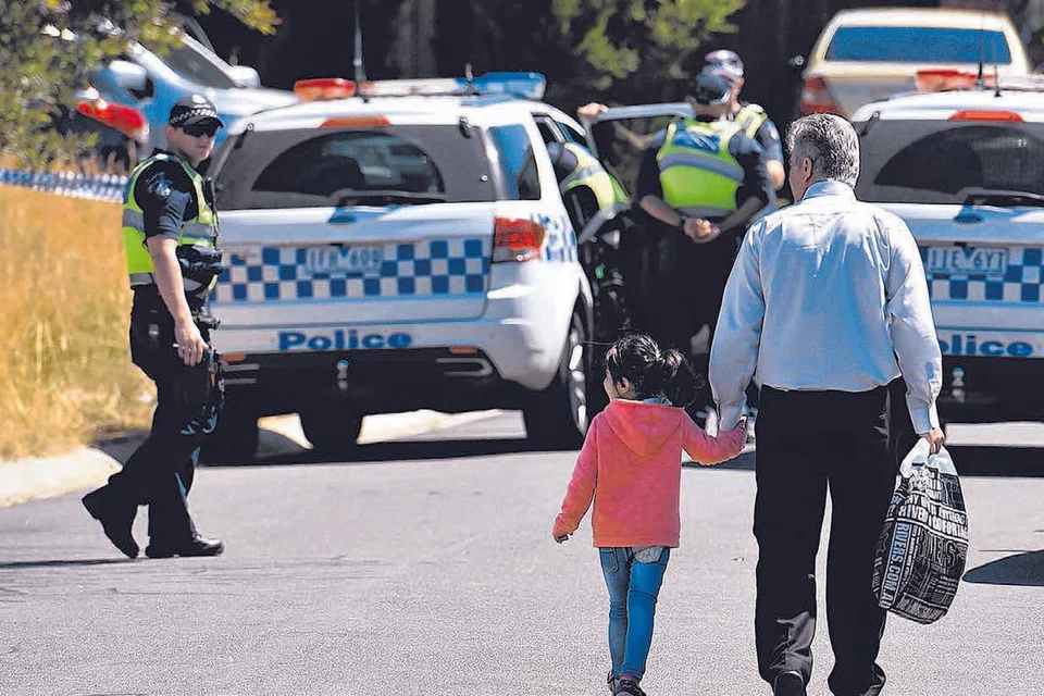 மெல்பர்ன் நகரில் உள்ள ஒரு வீட்டை போலிசார் சோதனை செய்தபோது ஒரு சிறுமியுடன் ஒருவர் அந்த வழியாக நடந்து செல்கிறார். படம்: ராய்ட்டர்ஸ்