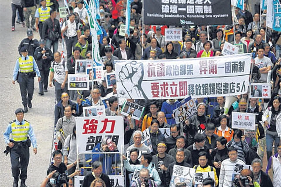 சீன அரசாங்கத்தை விமர்சித்து புத்தகங்களை வெளியிட்ட ஒரு பதிப்பகத்தைச் சேர்ந்த ஐந்து பேர் காணாமல் போனதற்கு எதிர்ப்புத் தெரிவித்து ஹாங்காங்கில் போராட்டம் நடந்தது. அந்த ஐவரையும் விடுவிக்கக் கோரி ஆர்ப்பாட்டக்காரர்கள் ஊர்வலமாகச் சென்றனர். படம்: ராய்ட்டர்ஸ்