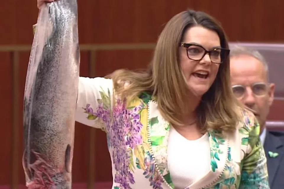 சுற்றுச்சூழல் அமைச்சரைப் பிரதிநிதித்து நாடாளுமன்றத்தில் அமர்ந்திருந்த ஜென்னி மெக்அலிஸ்டரை நோக்கி, பிளாஸ்டிக் பைக்குள் அடைக்கப்பட்ட, உயிரிழந்த பெரிய சால்மன் மீன் ஒன்றை எடுத்துக் காட்டினார்.