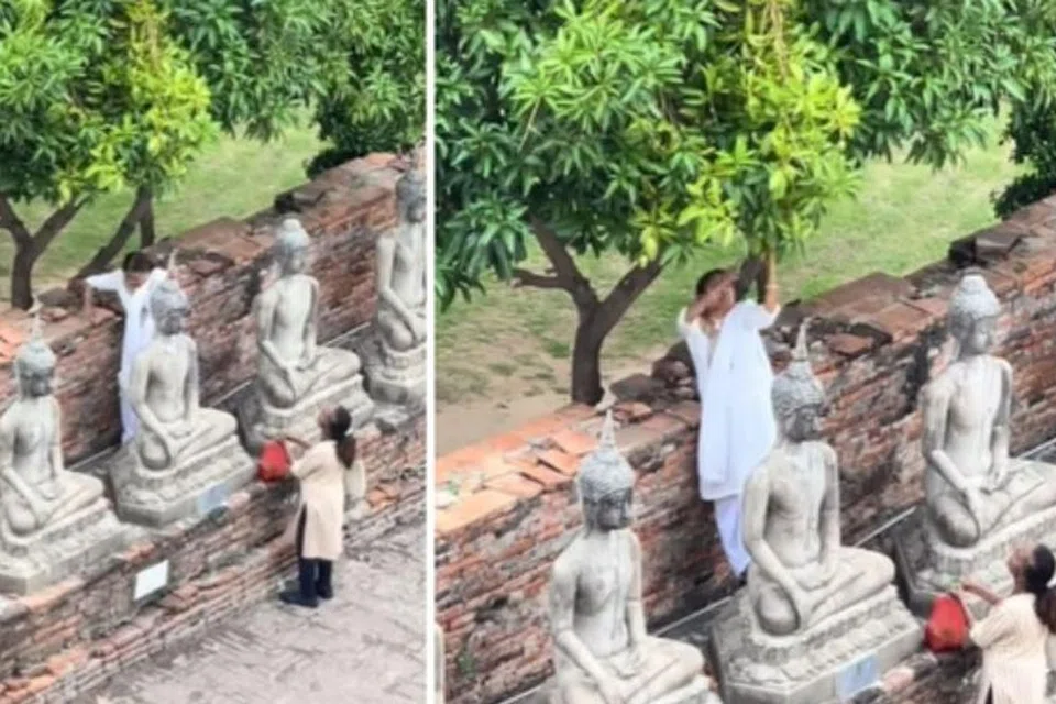 பேங்காக்: தாய்லாந்தில் சிலை ஒன்றின் மீது ஏறி மாம்பழங்கள் பறித்த இரண்டு பெண்கள், அந்நாட்டின் கலாசாரத்தை அவமதித்ததாகத் தற்போது சர்ச்சை ஒன்று வெடித்துள்ளது.