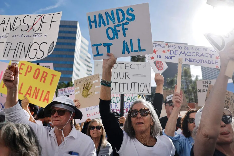 வெள்ளை மாளிகைக்கு அருகில் உள்ள வெளிப்புற அரங்கில் ‘குறுக்கிடாதீர்’ (Hands Off) என்று கூறும் பெரிய பதாகையை ஆர்ப்பாட்டக்காரர்கள் பிடித்தனர். ‘என் அதிபர் அல்ல’, ‘சர்வாதிகாரம் வந்துவிட்டது’, ‘எங்கள் சமூகப் பாதுகாப்பில் குறுக்கிடாதீர்’ என்று திரு டிரம்ப்புக்கு எதிரான வாசகங்கள் கொண்ட பலகைகளையும் ஆர்ப்பாட்டக்காரர்கள் பிடித்திருந்தனர்.