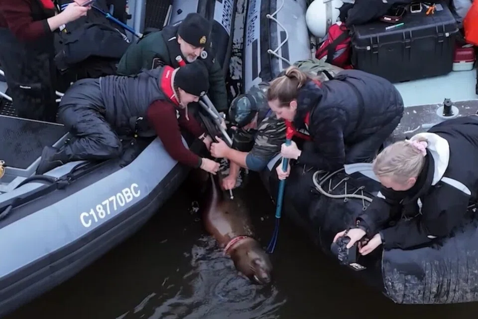 வான்கூவர்: கனடாவில் உள்ள பிரிட்டிஷ் கொலம்பியாவின் கவ்விசான் கடற்கரையில் ஒரு பெண் கடல் சிங்கம் கழுத்தில் கயிற்றுடன் சிக்கி தத்தளித்தது.