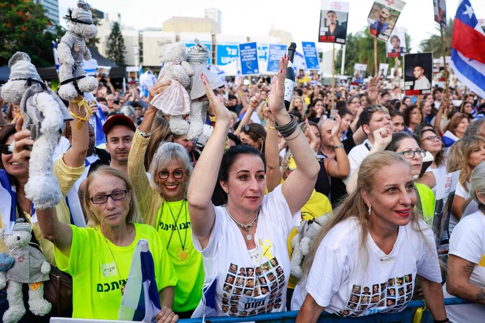 டெல் அவிவின் பிணையாளிகள் சதுக்கத்தில் நூற்றுக்கணக்கானோர் இஸ்ரேலியக் கொடிகளைக் கையில் ஏந்தி அசைத்து பிணைக் கைதிகளின் புகைப்படங்கள் கொண்ட பதாகைகளைப் பிடித்தனர்.