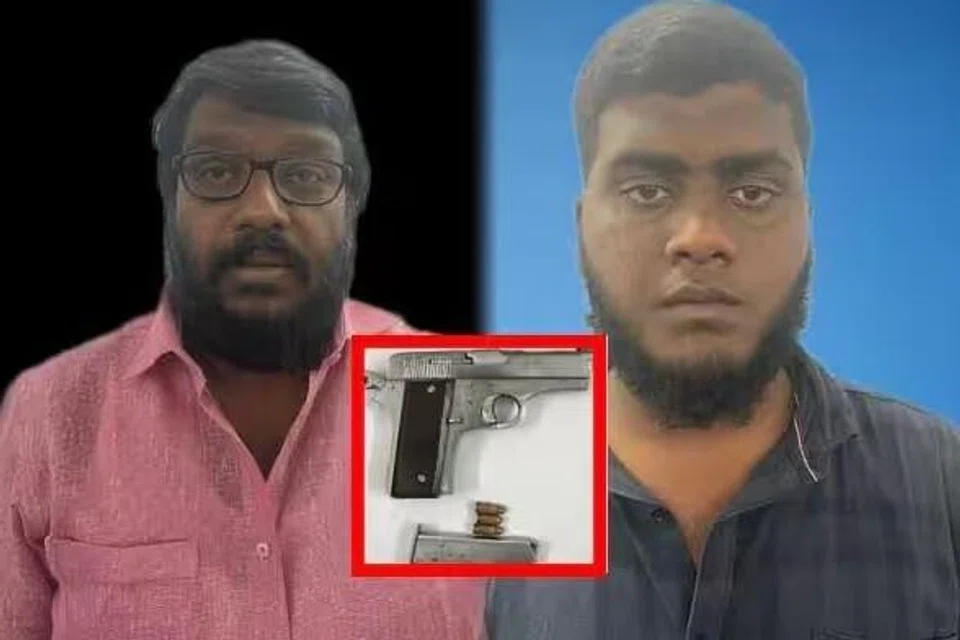 மேலப்பாளையத்தைச் சேர்ந்த அமீர் என்பவரும் ரத்ன பாலா என்பவரும் கைத்துப்பாக்கியுடன் கைதுசெய்யப்பட்டனர். - படம்: தினமலர்