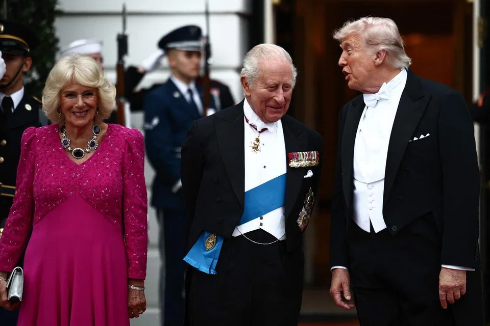 வெள்ளை மாளிகையில், செவ்வாய்க்கிழமை நடந்த இரவு விருந்துக்கு முன்னதாக, புன்முறுவலுடன் பிரிட்டனின் ராணி கமிலா அருகில் வர, மன்னர் மூன்றாம் சார்ல்ஸ் உடன் அமெரிக்க அதிபர் டிரம்ப் உரையாடுகிறார். - படம்: ஏஎஃப்பி