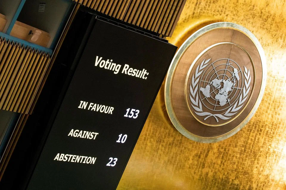 அந்தத் தீர்மானத்தை ஆதரித்து 153 நாடுகள் வாக்களித்து உள்ளன. 23 நாடுகள் வாக்களிப்பில் கலந்துகொள்ளவில்லை. அமெரிக்கா மற்றும் இஸ்ரேல் உள்ளிட்ட 10 நாடுகள் தீர்மானத்தை எதிர்த்தன.