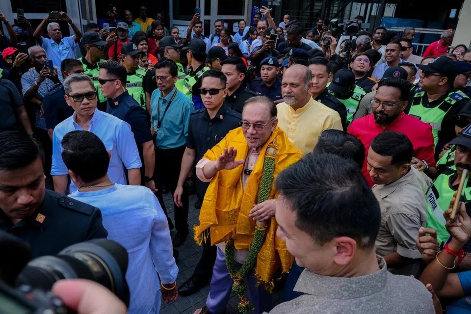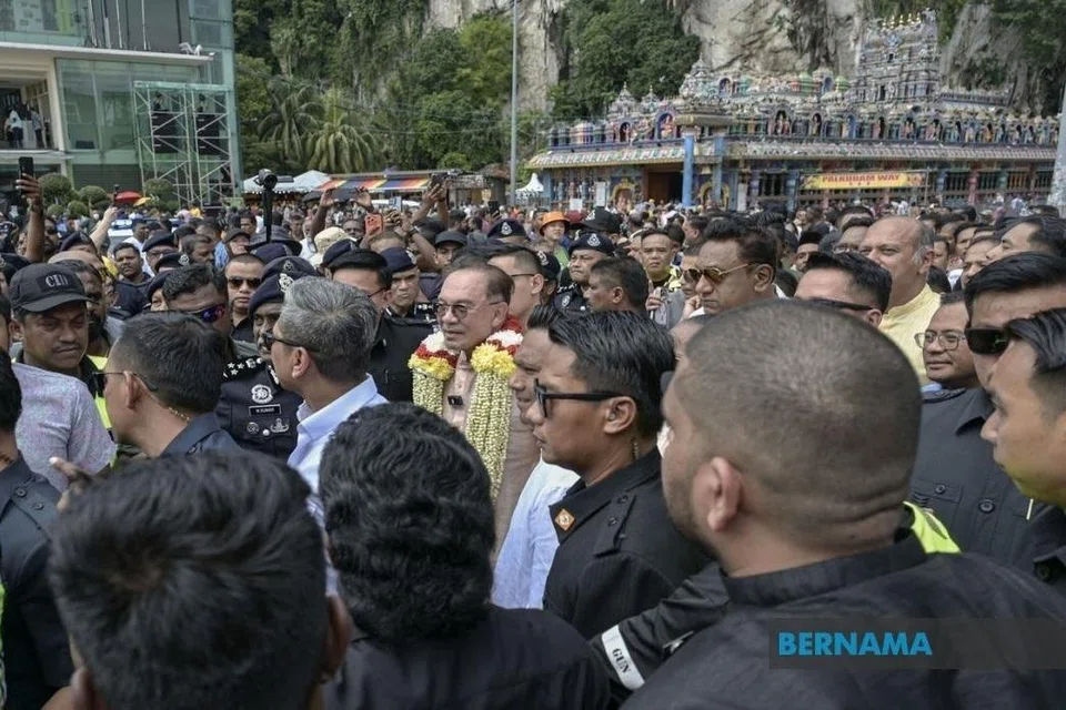 ஜனவரி 30ஆம் தேதி பிற்பகல் 2.30 மணியளவில் மலேசியப் பிரதமர் அன்வார் இப்ராகிம் (நடுவில், மாலையுடன்) பத்துமலை வளாகத்துக்கு வந்து சேர்ந்தார். - படம்: பெர்னாமா