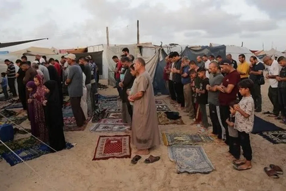 காஸாவின் கான் யூனிஸ் நகரில் தற்காலிக முகாம்களில் தங்கியிருக்கும் பாலஸ்தீனர்கள் கூட்டுத் தொழுகை நடத்தியுள்ளனர்.