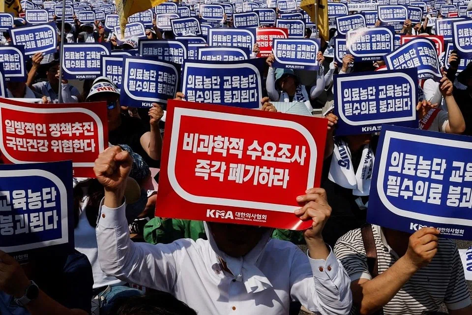 மருத்துவர் பற்றாக்குறையைப் போக்க மருத்துவப் பள்ளியில் மாணவர்கள் சேர்க்கையை அதிகரிக்கும் தென்கொரிய அரசு திட்டங்களுக்கு எதிர்ப்பு தெரிவித்து, கடந்த சில மாதங்களாக அந்நாட்டில் ஆயிரக்கணக்கான பயிற்சி மருத்துவர்கள் வேலை நிறுத்தப் போராட்டத்தில் ஈடுபட்டு வருகின்றனர். - படம்: ராய்ட்டர்ஸ்