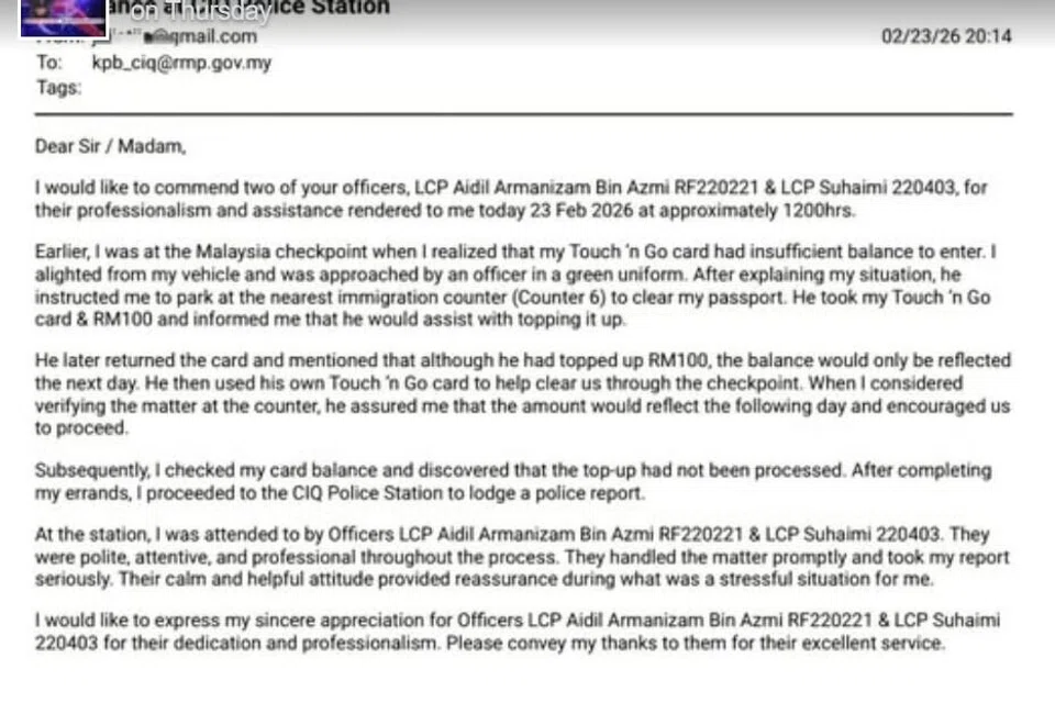 கட்டண அட்டையில் பணம் நிரப்பப்படவில்லை என்பதை பிறகு தெரிந்துகொண்ட ஓட்டுநர் அதுகுறித்து சோதனைச் சாவடியில் உள்ள CIQ காவல்நிலையத்தில் புகார் அளிக்கச் சென்றார். அங்கிருந்த இரு அதிகாரிகள் தமக்கு சிறந்த முறையில் உதவியதாக அவர்களைப் பாராட்டி வாகன ஓட்டுநர் மின்னஞ்சல் கடிதம் ஒன்றை மலேசிய அதிகாரிகளுக்கு அனுப்பியுள்ளார்.