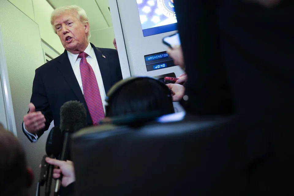 ஏர் ஃபோர்ஸ் ஒன் விமானத்தில் செய்தியாளர்களிடம் பேசும் அதிபர் டிரம்ப். - ஏஎஃப்பி